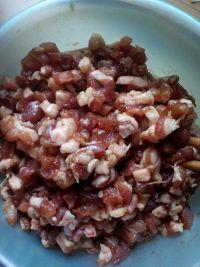 6.葱姜剁碎。将白菜,肉丁,粉条,葱姜放入干净盆中,加入油、盐、味极鲜酱油、鸡精拌匀成馅。(忘拍图了)