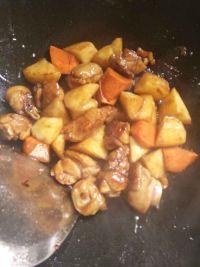 6.下鸡腿,土豆块翻炒至沾满糖色,加酱油