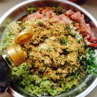 7.豆角和猪肉混合,放入全部香料:油,盐,五香粉,葱,姜,鸡精,味极鲜酱油,生抽,香油,拌均匀。