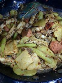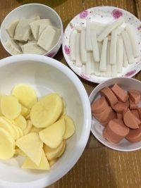 3.年糕(我选的是一条条那种,不用切)稍微焯水就拿起来,避免过烂;土豆,黄瓜也分别焯水,我都是分开来,没有一起倒下去,金针菇和腐竹容易熟,不用焯水,香肠也不需要
