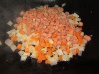 4.现将洋葱和胡萝卜丁下锅煸炒