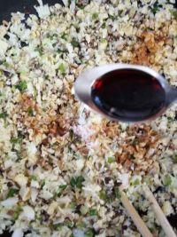 4.包菜碎和香菇,葱花,鸡蛋碎混合,放老抽,盐,十三香,香油调味。