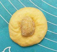 5.取一份小面团压扁包入椰蓉冬瓜馅收口滚圆放入蛋糕模中