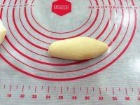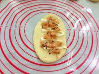 13.取出一个小面团,擀成牛舌状,铺上肉松、挤上沙拉酱。