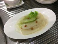 7.在同一沸水,加少许花生油后,再下步骤3的生菜芯,焯水30秒,捞起沥干水分后投入到步骤5的汤水中。