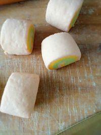 2.80克面粉加入1克白糖,适量西红柿汁揉成粉色面团,80克面粉加入1克酵母适量黄瓜汁揉成绿色面团,80克面粉加入1克酵母适量南瓜泥揉成黄色面团,盖盖发酵。