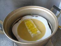 9. 把咸鸭蛋黄碾碎放在豆腐上面