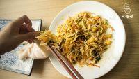 4.炒锅内加入适量油,油热后加红辣椒,之后立即放入姜蒜及螺蛳粉内调料包配料翻炒。炒出香味后倒入煮好的米粉,不一会可出锅。PS:即使没有填充鱿鱼那一步骤,单吃爆炒螺蛳粉味道也是杠杠的呢~