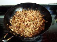 12.小火煮10分钟,大火收汁,加些鸡精,芝麻油煸炒匀,黑笋干肉馅做好了。