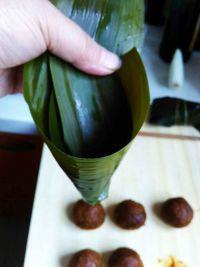 7.用西米填满后,把粽叶折回包好,用马莲孔扎结实